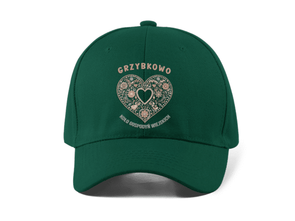 Na przednim panelu znajduje się stylowy haft w kształcie serca wypełnionego kwiatami – symbolu kobiecości, wspólnoty i polskiej wsi. Nad i pod wzorem umieszczony jest napis „Koło Gospodyń Wiejskich” oraz możliwość personalizacji nazwą miejscowości, dzięki czemu każda czapka staje się jedyna w swoim rodzaju.