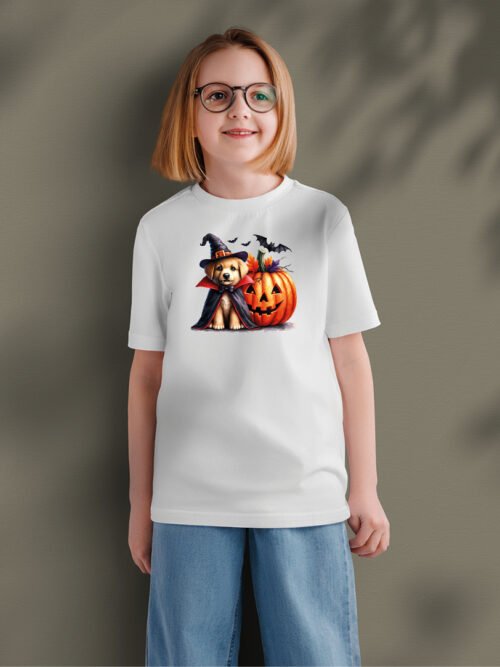 Halloweenowa koszulka dziecięca „Duch i nawiedzony dom” to idealny wybór na Halloween dla małych miłośników mrocznych i tajemniczych opowieści.