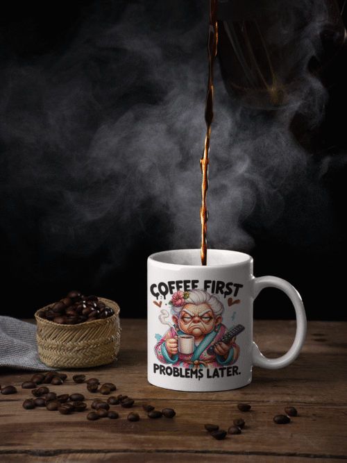 Kubek dla kawosza z humorem Coffee first. Problems later.