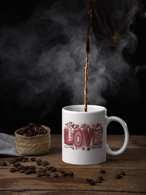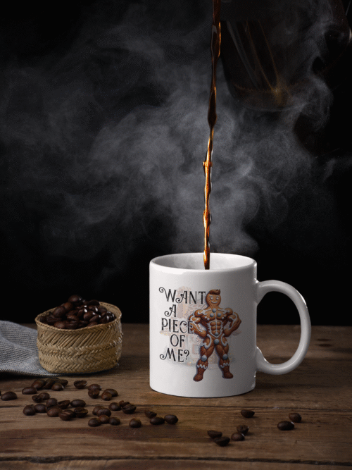 Zabawny kubek z czarnym kotem trzymającym kawę
